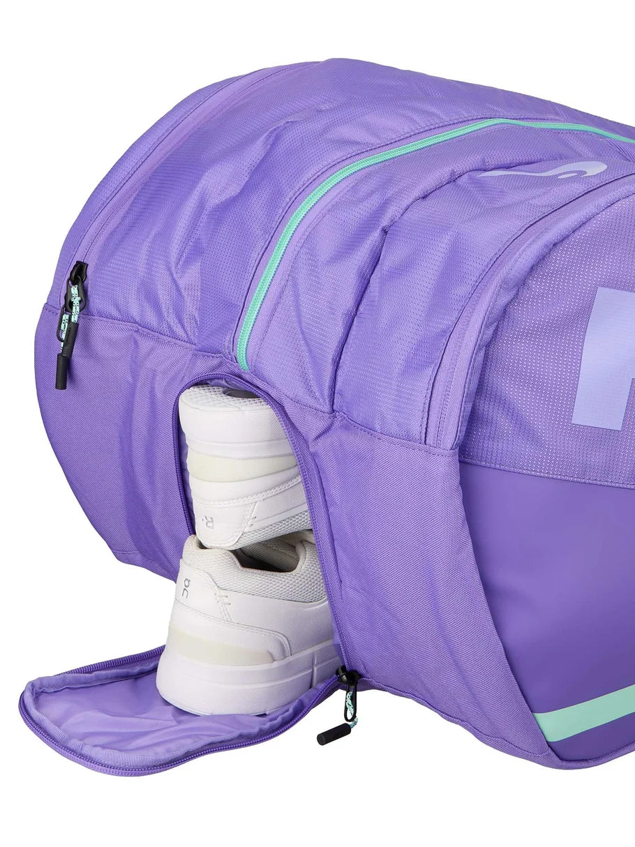 El Head Tour Racquet Bag XL Morado para Tenis es un raquetero profesional de gran capacidad, diseñado para jugadores que necesitan transportar todo su equipo de forma organizada y segura. Este modelo forma parte de la línea Tour de HEAD y es utilizado por jugadores del equipo de la marca, incluyendo al tenista Lorenzo Musetti.